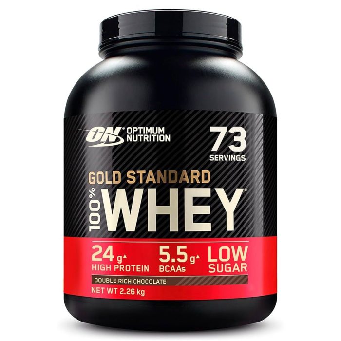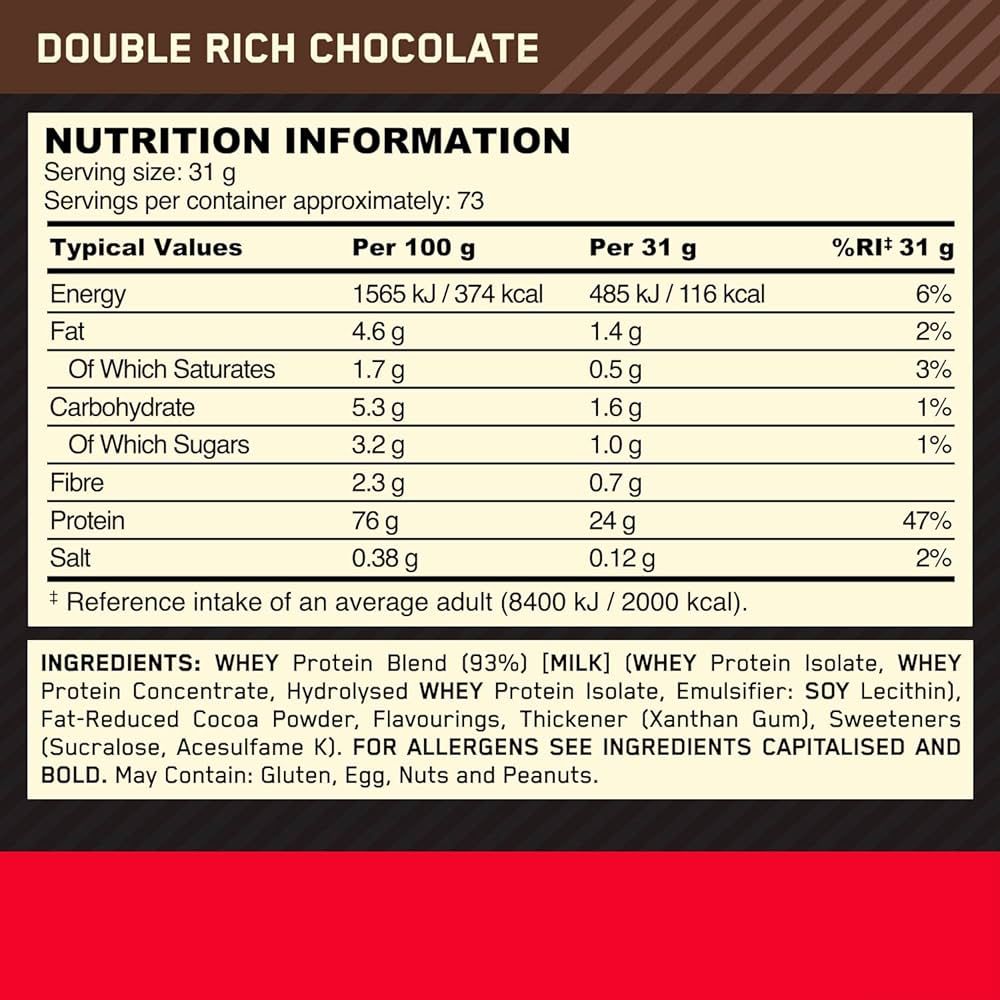Optimum Nutrition Gold Standard 100% Whey Muscle Building and Recovery Protein Powder With Naturally Occurring Glutamine and BCAA Amino Acids, Double Rich Chocolate Flavour, 73 Servings, 2.26 kg